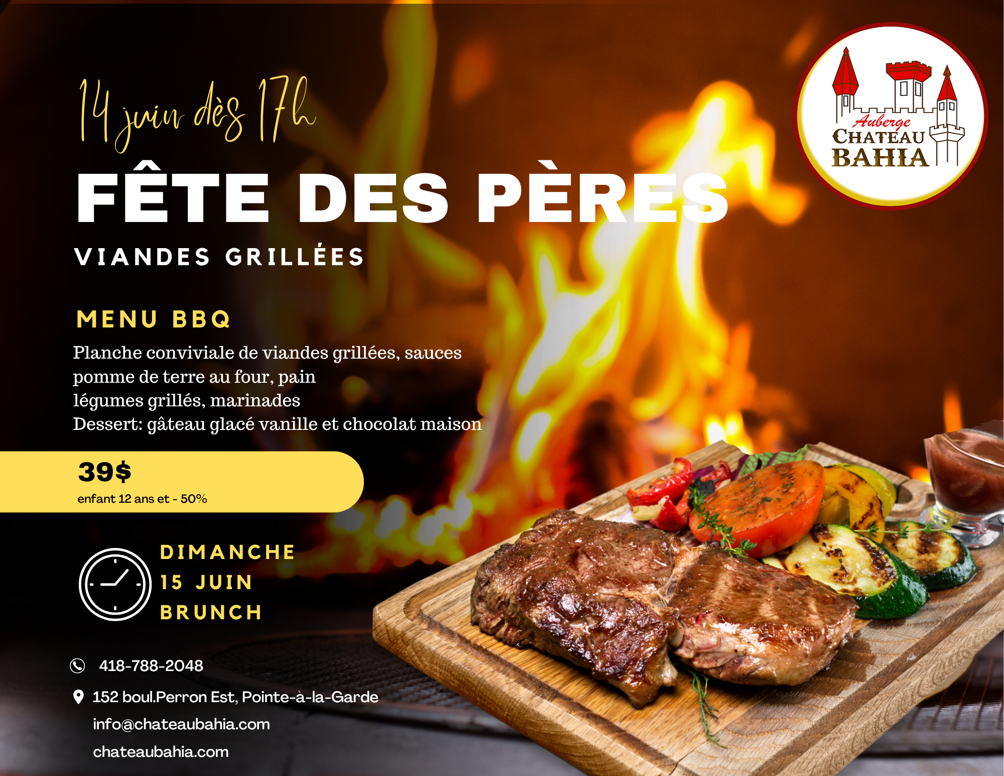 L’équipe de l’Auberge Château Bahia prépare une soirée Grill pour célébrer les pères. Dans une ambiance chaleureuse, vous pourrez savourer une planche de viandes grillées accompagnées de pomme de terre au four, légumes grillés, marinades, sauces et pain servit en plat convivial a deux, en famille ou avec des amis. Réservez votre table!